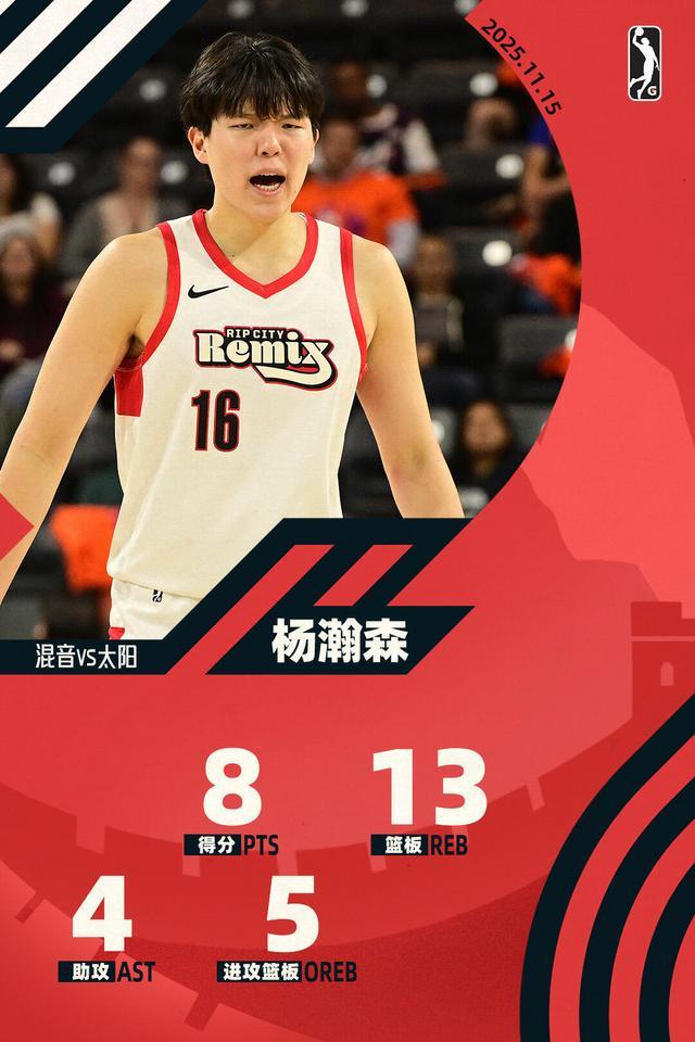 出战G联赛的第一战,杨瀚森既遇到了故知,又拿到了数据,并且最关键的是,他所在的混音队赢了球,还是一度落后超过20分的情况下逆转取胜的。